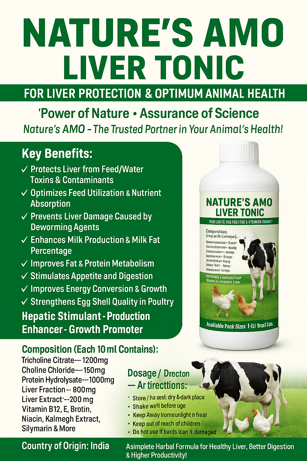 NATURE’S AMO LIVER TONIC For Liver Protection – लिव्हर संरक्षणासाठी हर्बल टॉनिक “निसर्गाची शक्ती • विज्ञानाची हमी” Nature’s AMO — तुमच्या जनावरांच्या आरोग्याचा विश्वासू साथी! उत्पादनाचा प्रकार (Type): हर्बल लिव्हर टॉनिक (Animal Feed Supplement) ➡ मानव किंवा वैद्यकीय वापरासाठी नाही (Not for Human/Medicinal Use) संघटन (Composition) — प्रत्येक 10ml मध्ये: Tricholine Citrate – 1200mg Choline Chloride – 160mg L-Lysine – 20mg DL-Methionine – 20mg Glycine – 10mg Protein Hydrolysate – 1000mg Liver Fraction (Fresh Liver 3.75gm पासून तयार) – 800mg